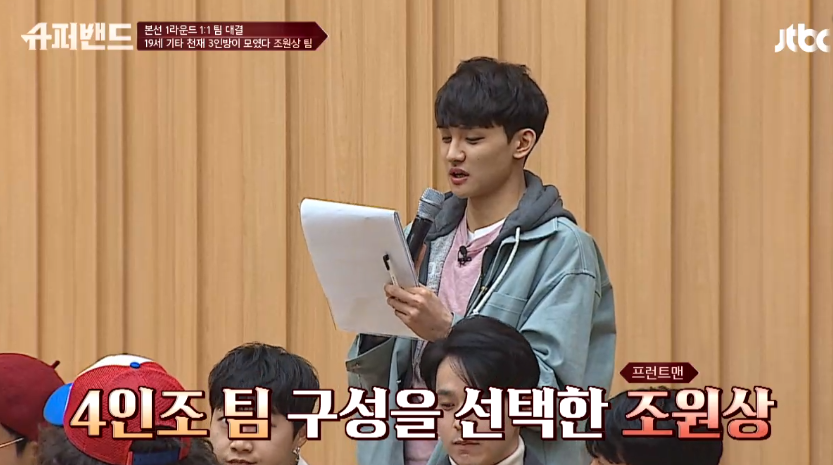 슈퍼밴드 조원상은 첫 미션 1:1 대결에서 좋은 성적으로 16명의 프런트맨 이 되었다. 팀 구성 당시 JTBC 슈퍼밴드 19세 기타 천재 3인방인 이강호, 임형빈, 김영소 와 함께 조원상팀을 꾸리며 기타 쌀쓸이범 으로 경쟁자들의 원승을 받기도 하였다.