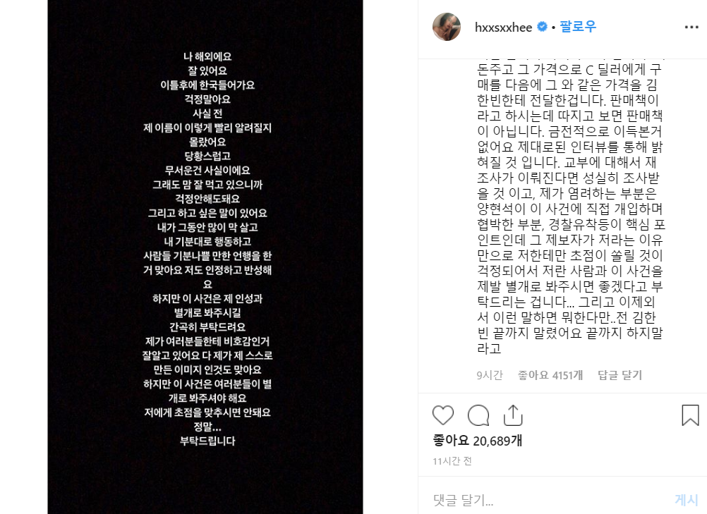 한서희는 인스타그램을 통해서 마약사건과 관련된 공식 입장을 공개하며 아이콘 비아이와 위너 이승훈 사건 개입에 대하여 심경을 전했다.