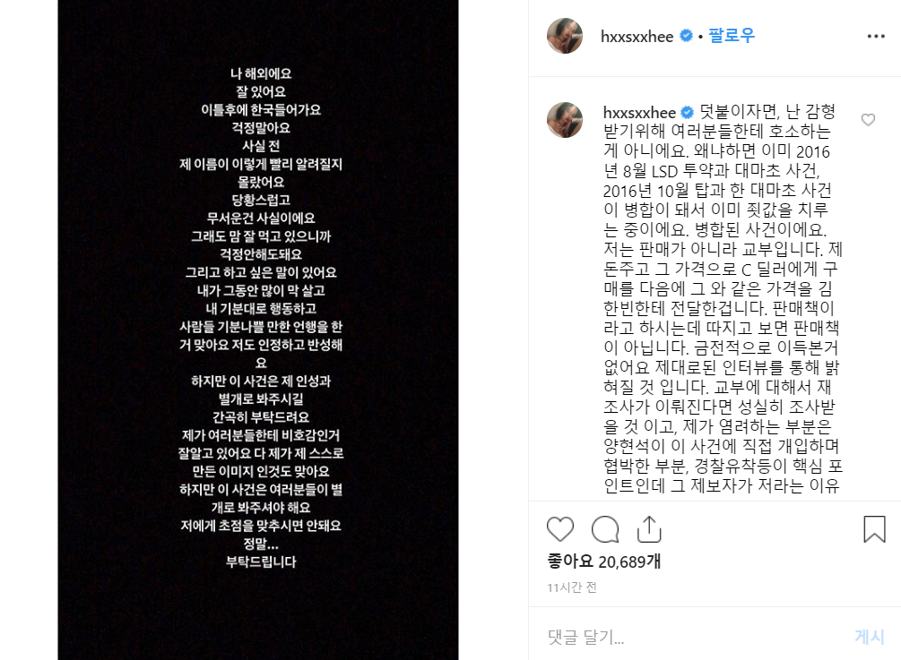 한서희 마약 사건 개입 논란에 대한 인스타그램 공식 입장