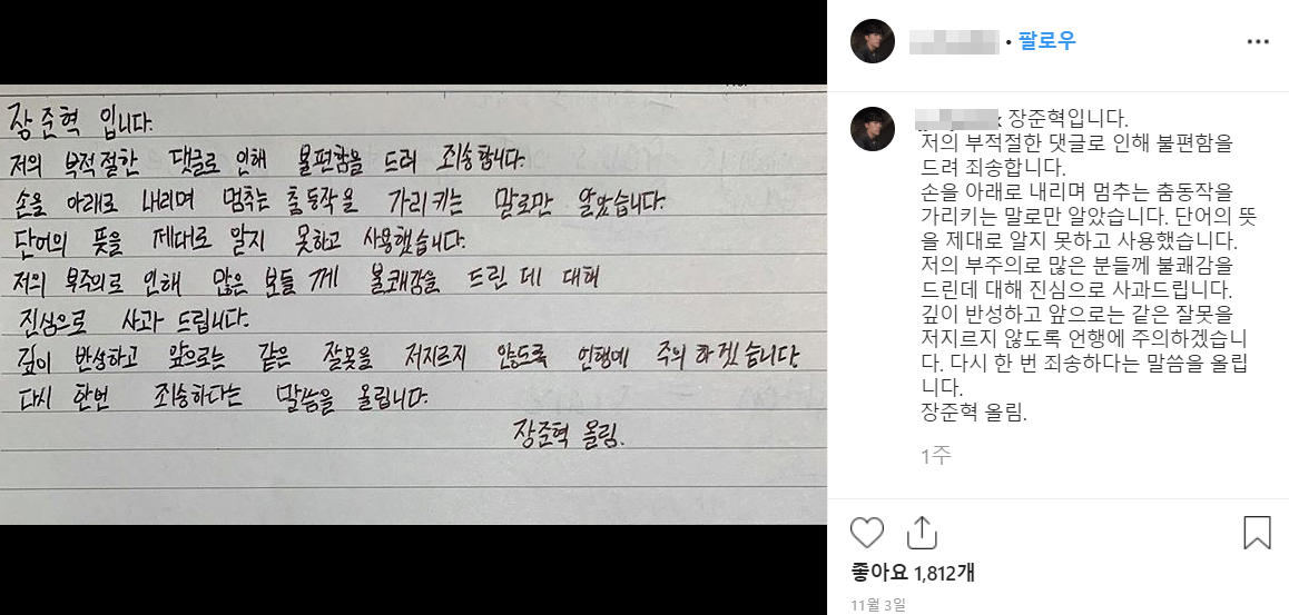 장준혁입니다. 저의 부적절한 댓글로 인해 불편함을 드려 죄송합니다. 손을 아래로 내리며 멈추는 춤동작을 가리키는 말로만 알았습니다. 단어의 뜻을 제대로 알지 못하고 사용했습니다. 저의 부주의로 많은 분들께 불쾌감을 드린데 대해 진심으로 사과드립니다. 깊이 반성하고 앞으로는 같은 잘못을 저지르지 않도록 언행에 주의하겠습니다. 다시 한 번 죄송하다는 말씀을 올립니다. 장준혁 올림.