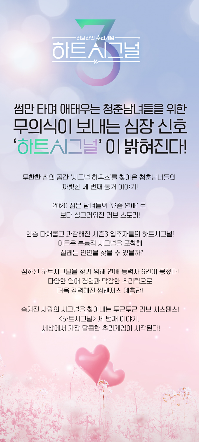 하트시그널 시즌3 일반인 출연자 명단 공개. 3월 25일 첫 방송되어 썸만 타며 애태우는 청춘남녀들을 위한 무의식이 보내는 심장 신호‘하트시그널’이 밝혀진다! 무한한 썸의 공간 시그널 하우스'를 찾아온 청춘남녀들의 짜릿한 세 번째 동거 이야기! 2020 젊은 남녀들의 '요즘 연애 로 보다 싱그러워진 러브 스토리!